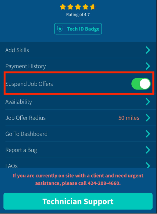 Step 1: Open the Tech App, click on your profile picture in the top-left corner, and select "Suspend Job Offers" (see below).