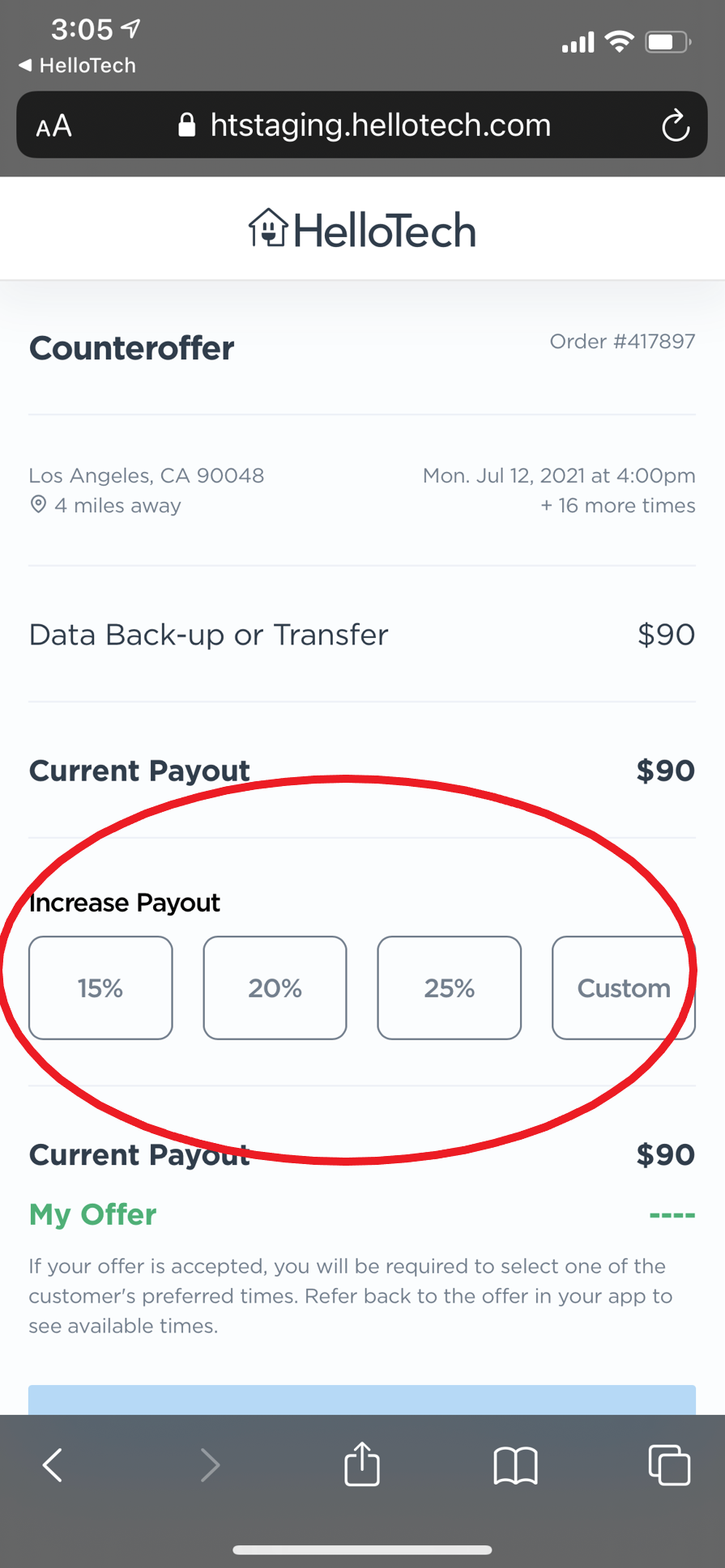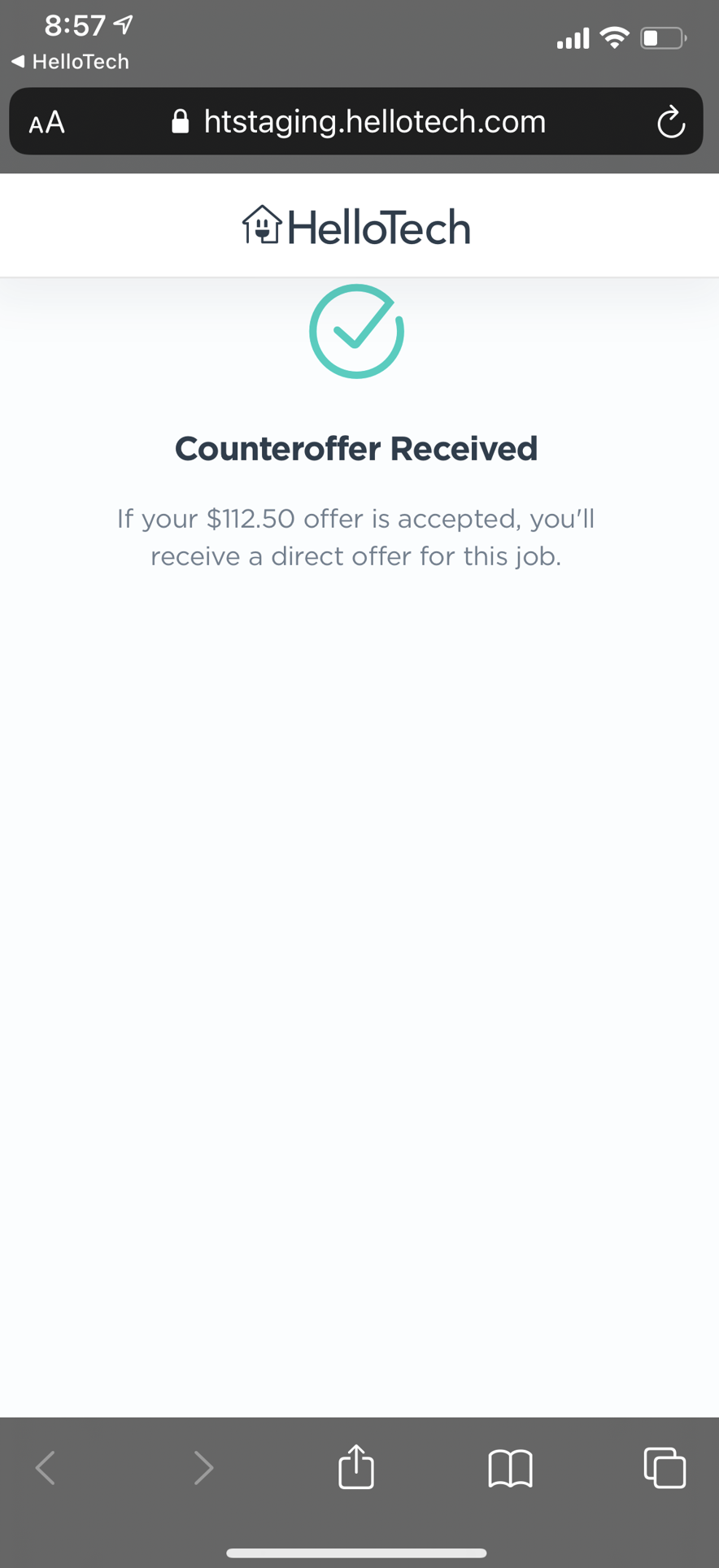 - If your counteroffer is accepted, you will receive a Direct Offer for that job in your HelloTech App at the amount that you countered. You will then have 3 hours to accept the Direct Offer. Direct Offers are made between the hours of 9am and 9pm Eastern Daylight Time.